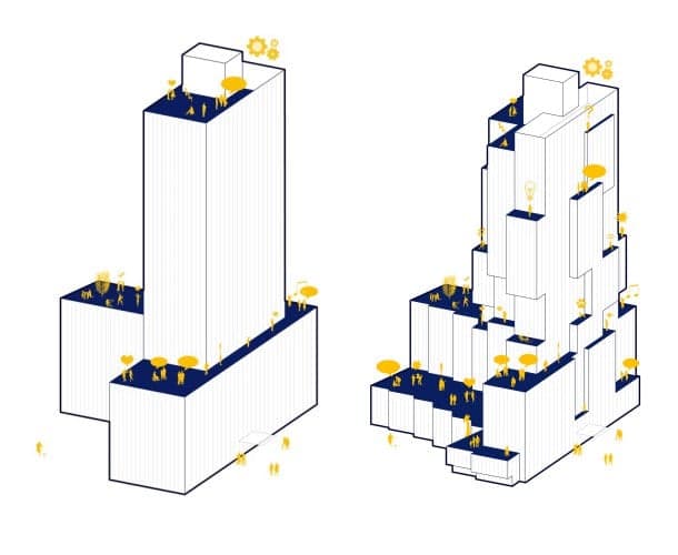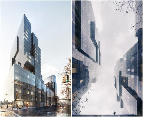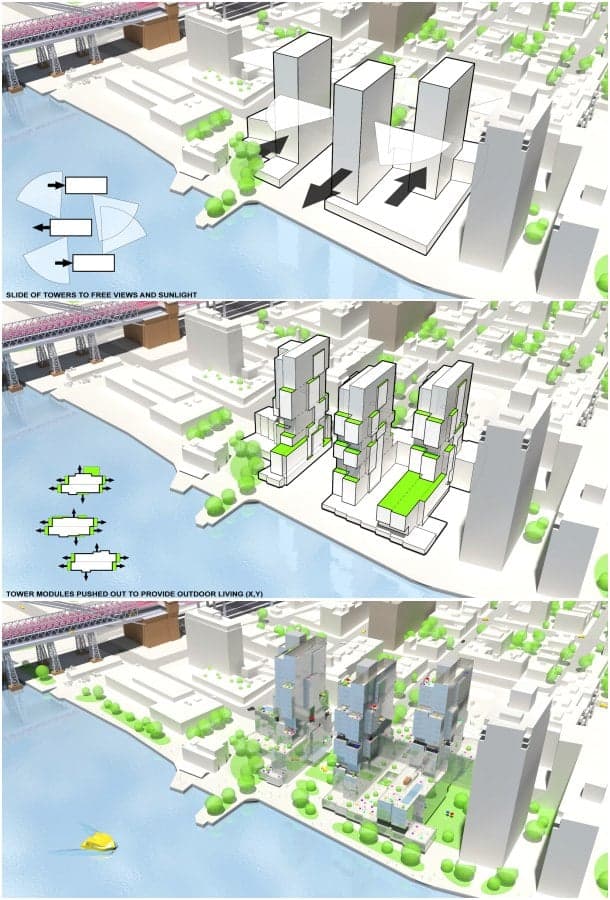 El conjunto de estas tres torres implica la construcción de 74.000 metros cuadrados de espacio residencial. Esa superficie está repartida en unos 857 apartamentos, sabiendo que 171 de ellos tendrán un precio más asequible. La planta baja está ocupada por espacios comerciales, y hay azoteas con jardines, piscina, y espacios deportivos para uso comunitario. Las fachadas son de vidrio, pero en ellas se crean bellas composiciones con volúmenes que sobresalen. Este aspecto es probablemente el más interesante del proyecto. Hace que las torres se vean como hermosas esculturas en el skyline de la ciudad.