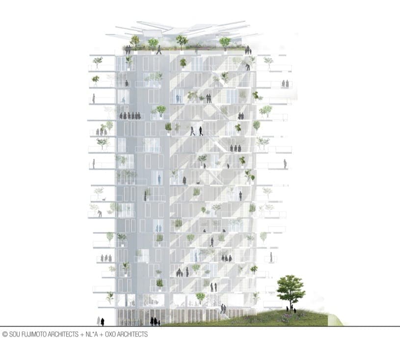 El proyecto Arbre Blanc Montpellier fue diseñado por el arquitecto Sou Fujimoto, Nicolas Laisné Associés, y Manal Rachdi Oxo Architects. Imágenes renderizadas de RSI-Studio.