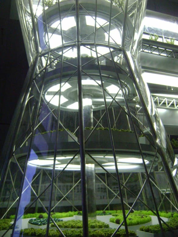 Una de estas granjas de 10 pisos (la planta baja ocupa 140m2) puede producir una cantidad de alimentos equivalente a 2,4 hectáreas de terreno cultivado. Los arquitectos autores explican de la siguiente manera su idea: