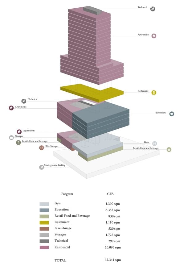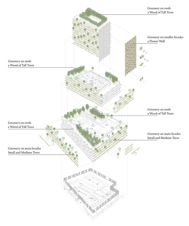 Boeri tomó buena nota de la arquitectura circundante. El objetivo era añadir al diseño de la Torre Wonderwoods determinados elementos que la integraran con su entorno. Por eso colocó el volumen de la torre retranqueado del resto del edificio, el cual está destinado a apartamentos. Pero también se incluyen oficinas, áreas de fitness y yoga, parking, y espacio destinado al ocio.
