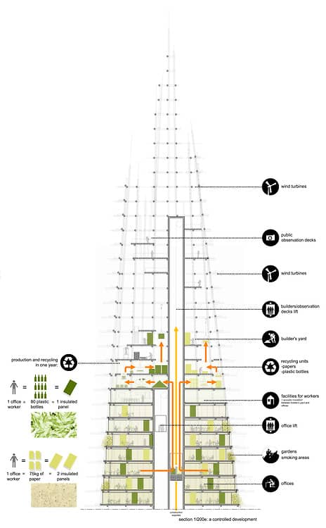 Esta singular torre se empezaría a construir a partir de una estructura de tubos de acero, que recuerda al andamio de bambú asiático. Pero también emplearía paneles prefabricados hechos con residuos. Una vez estuvieran ocupadas las primeras plantas de oficinas, parte de los residuos que generaran serían utilizados para la construcción de las plantas superiores. Con el fin de hacerla aún más sostenible, London Organic Skyscraper tendría en las plantas superiores unas instalaciones de reciclaje, y capacidad de producción de energía eólica.