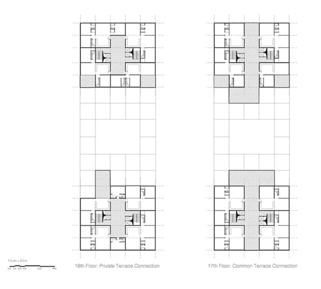 Todas estas ideas son estupendas, no solo por los beneficios pasivos que adquiere el edificio, y su organización interna en dos torres (ver planos de plantas tipo). Pero tenemos nuestras dudas de que se hayan sabido llevar a la práctica de una manera correcta. Nos hacemos la siguiente pregunta: ¿realmente a la gente le gusta tener tan cerca las miradas vecinas?