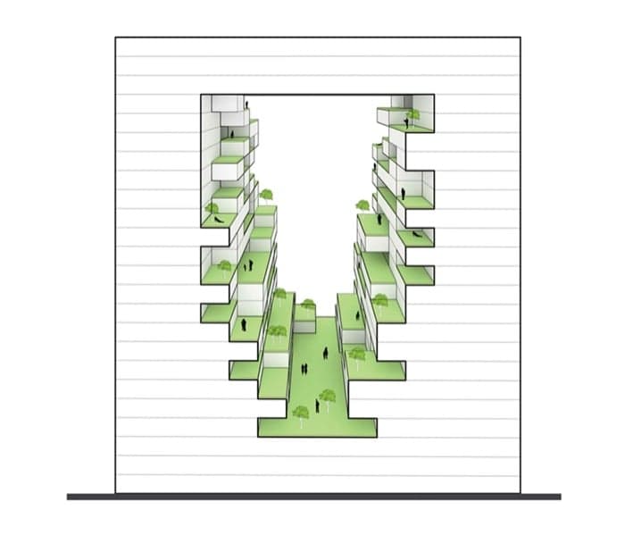 Por deseo expreso del cliente, este moderno condominio debía incorporar ciertos elementos del estilo de vida de las pequeñas ciudades. Pero también es una torre que incorpora aspectos bastante comunes de la arquitectura sostenible. Y lo hace favoreciendo la interacción entre los vecinos.