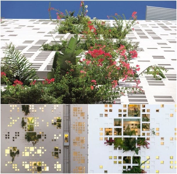 Durante el día, lo que veremos es un interesante juegos de sombras en estas fachadas con vegetación.