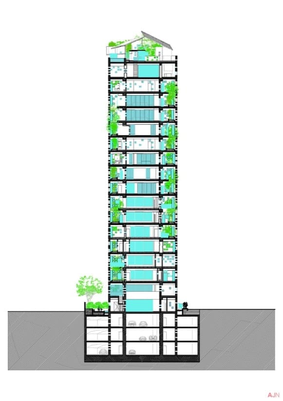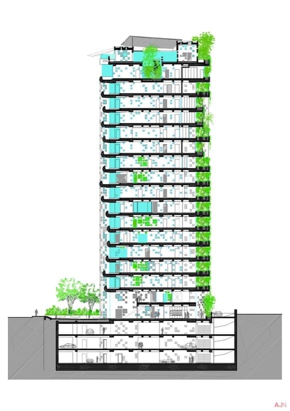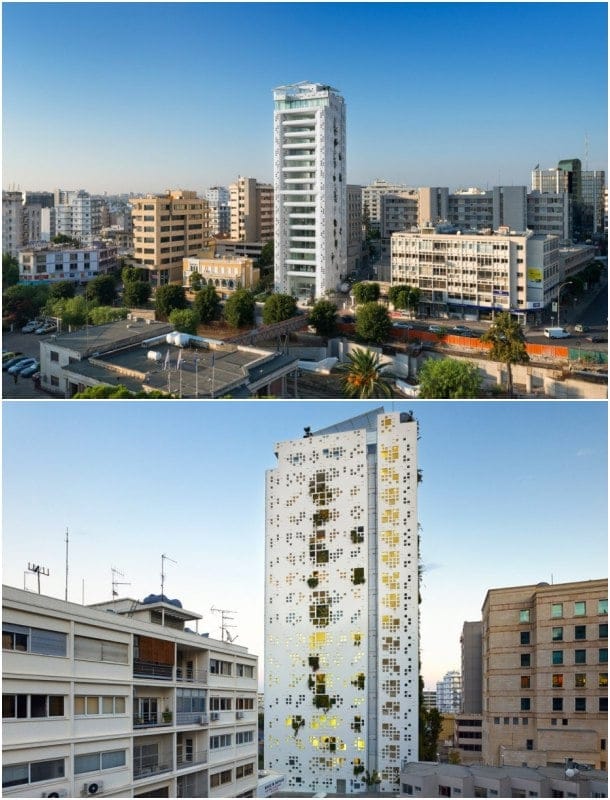 En la memoria del proyecto se puede leer que la fachada sur está ocupada en un 80% por vegetación. Aquí las plantas actúan como un mecanismo natural de control solar para los apartamentos y oficinas durante los meses de verano, pero no es así en invierno. Esta disposición es perfectamente compatible con la variedad de plantas trepadoras de Chipre, de tal manera que ellas se extienden según los cambios estacionales. Desgraciadamente ese texto del arquitecto no incluye información alguna relacionada con cualquiera de las características sostenibles que nos gustan ver en los proyectos.