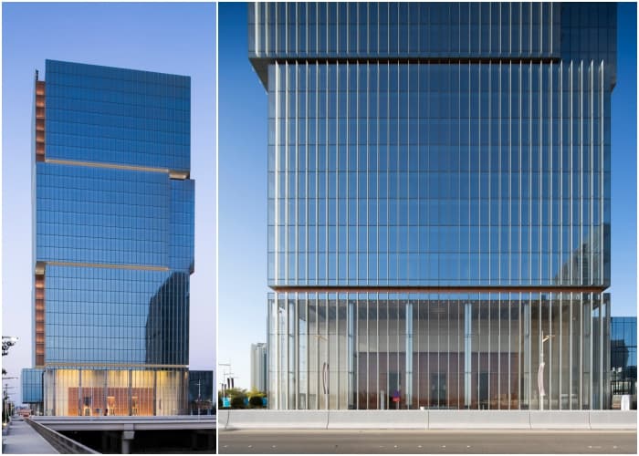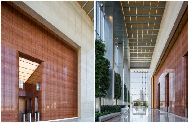Su podio tiene locales comerciales, y un impresionante vestíbulo principal de tres pisos de altura. En general, este proyecto nos parece una solución sumamente elegante.