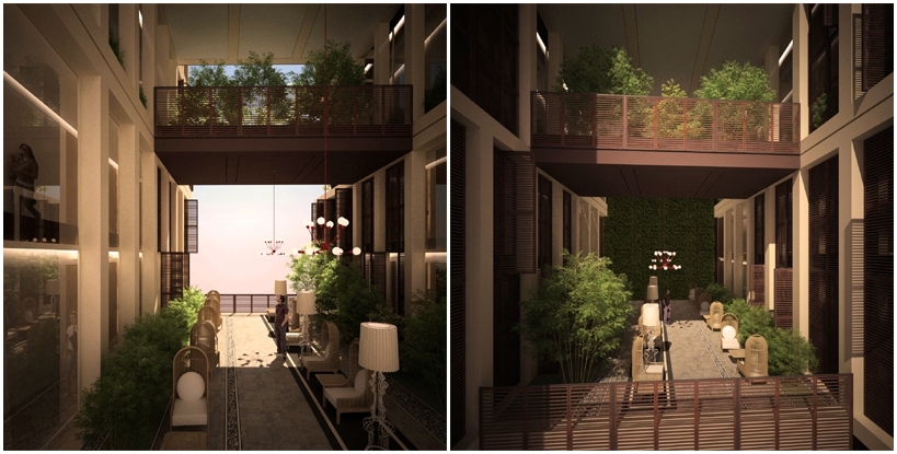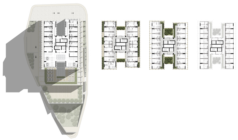 El interior presenta un núcleo con dos pasillos, que distribuyen apartamentos de 59 y 112m2.