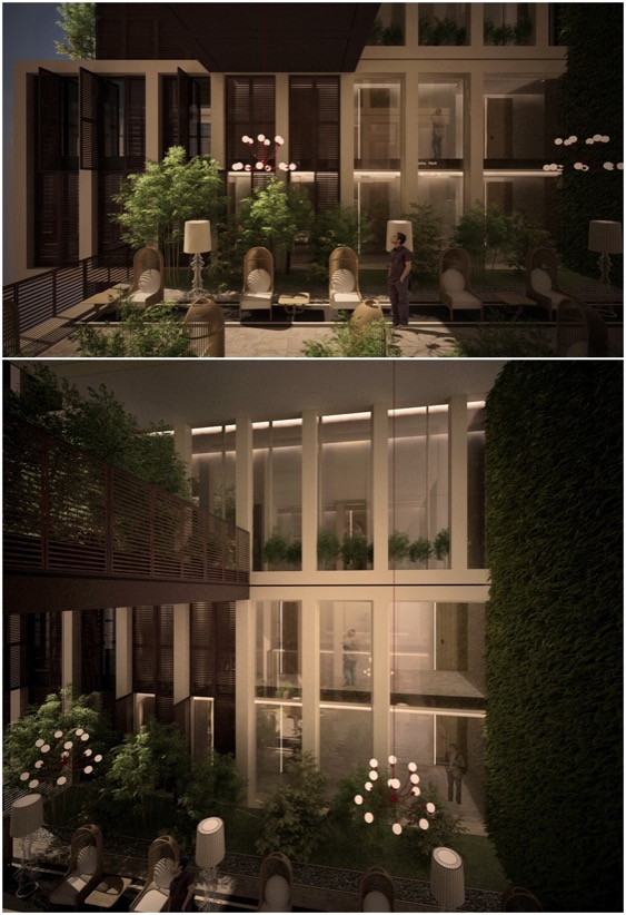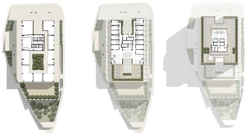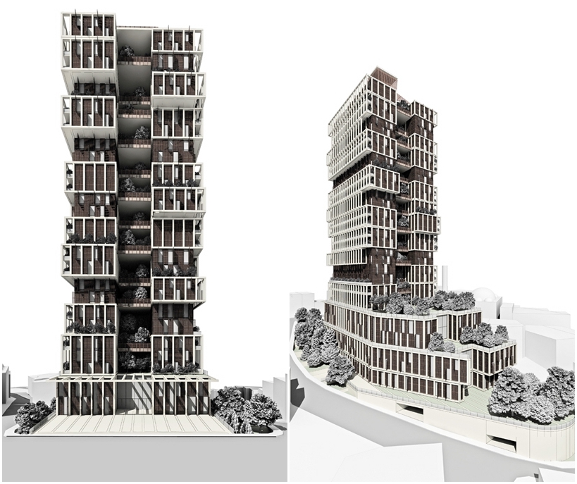 La fachada de esta torres se compone de “cajas abiertas” que marcan un potente ritmo modular. Por otro lado, la necesidad de llevar la naturaleza a la ciudad se ha llevado a cabo integrando un jardín en cada nivel. Por eso la torre presenta unos patios abiertos presididos por enormes jardines verticales. Esto último se aprecia mejor en las secciones.