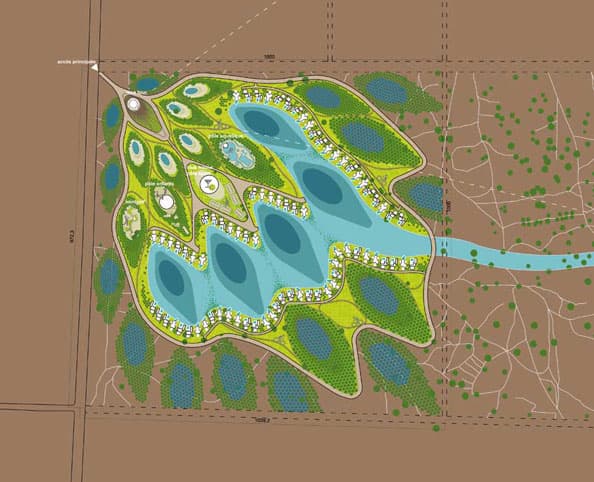 Este proyecto está distribuido con usos muy variados. Incluye oficinas, viviendas, hotel, varios restaurantes, gimnasio y spa… Además hay un centro de congresos, y varias instalaciones deportivas. Eso sí, llama la atención el gran protagonismo que tiene el agua en esta implantación, a pesar de que en esa parte de África sea un bien bastante escaso. Tal vez por eso, en los retoques posteriores de su diseño las áreas inundadas se redujeron.