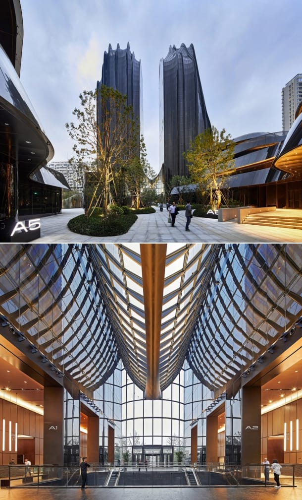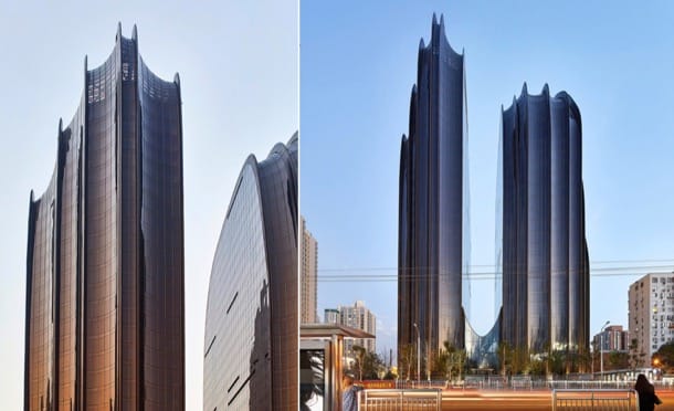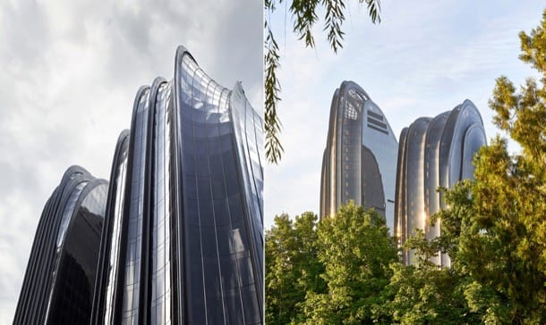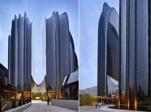 Estas imágenes corresponden a un proyecto de MAD Architects. Se trata de un complejo de uso mixto (oficinas y espacios públicos), situado en el Parque Chaoyang de Pekín. De este trabajo destaca el diseño de las Torres Chaoyang, con una fachada llena de superficies curvas, y vidrio negro.