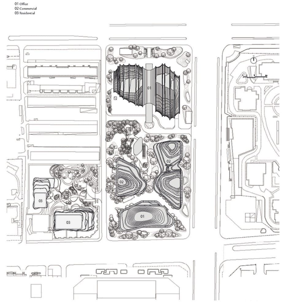 El diseño para Chaoyang Park Plaza comienza con el entendimiento de que el parque es parte de la trama. Toma la belleza natural de lagos y montañas. El complejo arquitectónico puede leerse como un paisaje urbano futurista, en el que los edificios de gran altura actúan como cumbres; los edificios de oficinas individuales como laderas; las oficinas de alta gama como colinas; y los edificios residenciales como cordilleras. Todo ello en combinación con elementos clásicos del paisaje: lagos, manantiales, bosques, arroyos, valles, rocas, y cumbres.