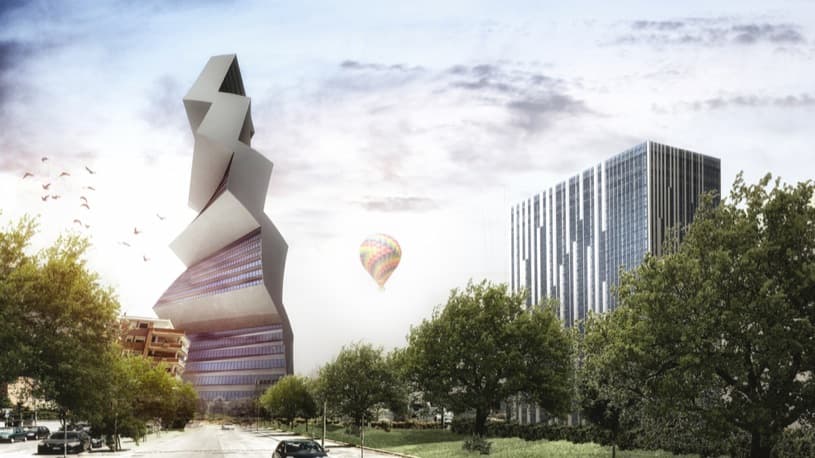 Este concepto tan atrevido de torre recibe el nombre de Twilt Tower. Se llama así porque su forma surge como la combinación de una torsión (twisted) y una inclinación (tilted). Se diseñó a modo de respuesta alternativa a la Torre Eurosky, con la que no estaban muy de acuerdo sus autores.