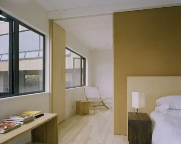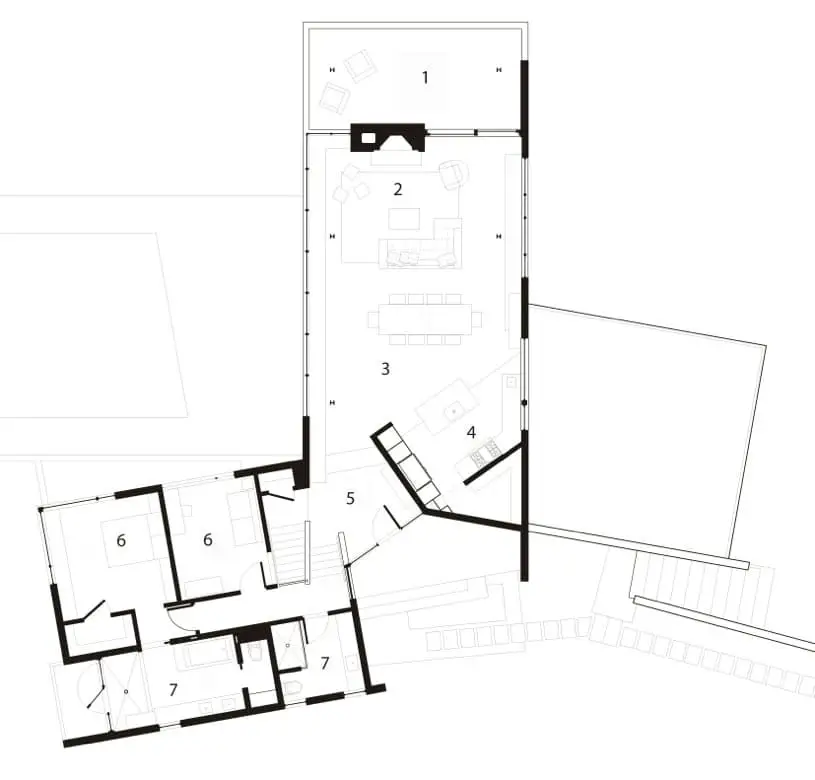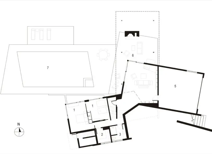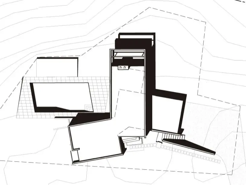 La organización de esta casa se realiza en dos volúmenes. Hay uno para el salón, comedor y cocina, y otro para los dormitorios y cuartos de baño. Junto a una sala de estudio se ha colocado el dormitorio principal, que cuenta con un interesante cuarto de baño que tiene una ducha al aire libre (en una pequeña terraza). Los otros dos dormitorios están abajo, y comunicados entre sí, aunque mantienen entradas independientes. El análisis de los planos de planta desvela que la dirección de la escalera de acceso exterior continúa dentro. Eso hace que la cocina y escalera principal no estén alineadas con los ejes principales de la vivienda.