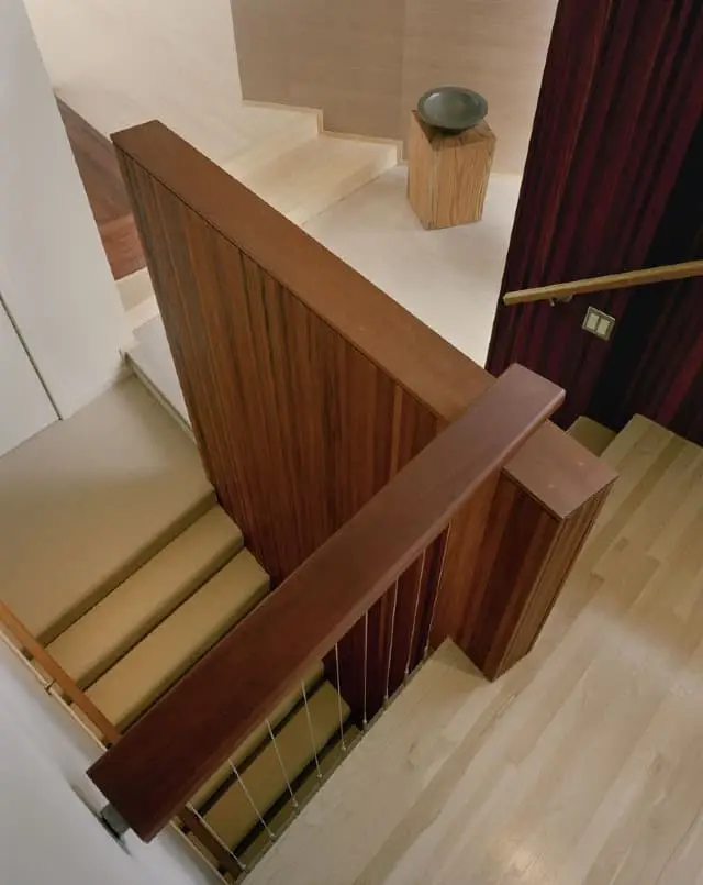 En la Casa Bluff predominan los acabados de madera, tanto dentro como en el exterior. Las puertas de madera se ven robustas y de buena calidad, lo mismo que la barandilla de la escalera. Otro aspecto interesante es que la carpintería metálica de las fachadas mantiene el mismo acabado y color que la estructura. En líneas generales, se trata de una decoración bastante sencilla, pues lo más sofisticado lo aporta la propia arquitectura.