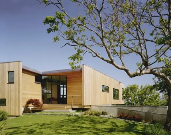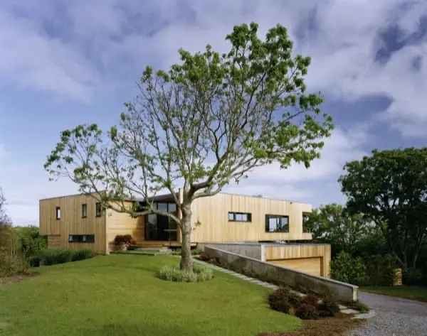 Bluff House es también una de esas casas de campo que resuelven con habilidad el desnivel del terreno. La entrada principal se hace por el nivel superior, justo al final de la pendiente de la colina. Pero lógicamente el garaje está situado en el nivel inferior. Hay un jardín delantero que marca el camino hacia la puerta, y un jardín trasero donde está la piscina. Esta fachada trasera es la que tiene las mejores vistas al mar.