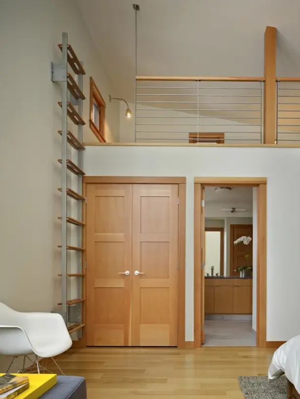 Un aspecto importante de este proyecto es la inclinación que se le ha dado a las cubiertas. Eso ofrece techos altos en la sala principal, y permite que en la planta alta se pueda aprovechar un espacio como altillo en el dormitorio de huéspedes. Está situado justo encima del baño (accesible mediante una escalerilla).