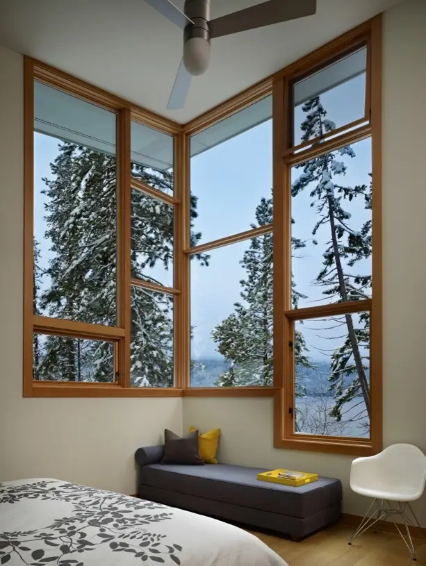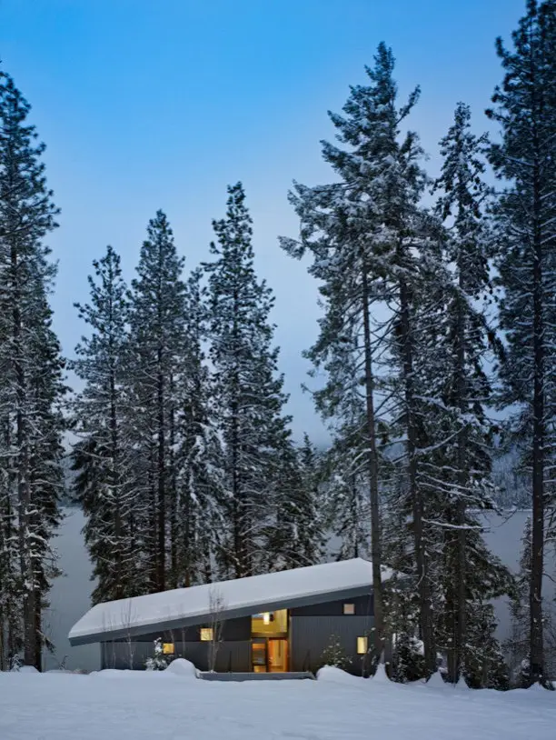 Esta casa de campo se beneficia en verano de la sombra de los árboles que la rodean. Eso le permite camuflarse en el paisaje gracias a los materiales utilizados durante su construcción. La madera de cedro rojo occidental es uno de ellos, así como el abeto de douglas, muy abundantes en la región.