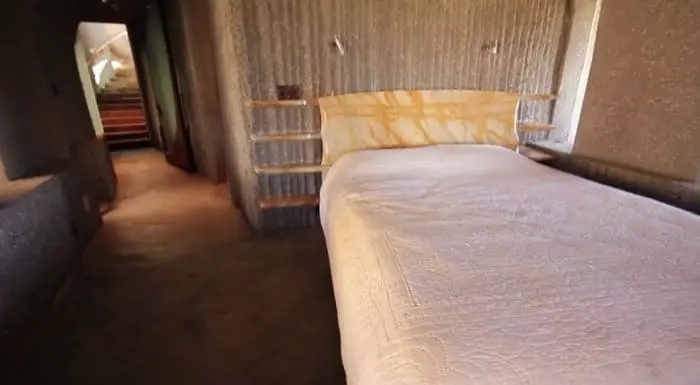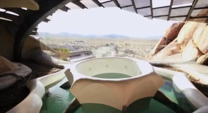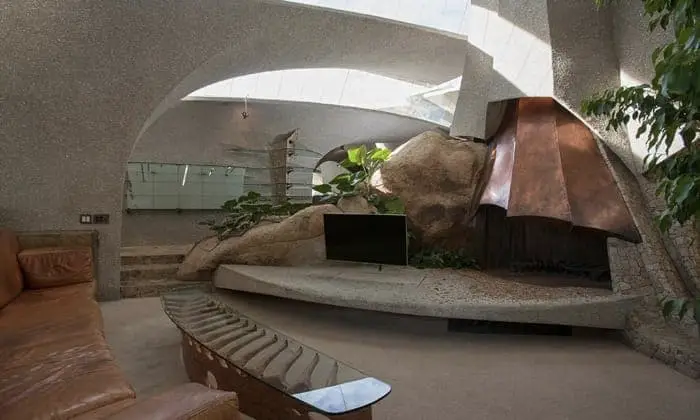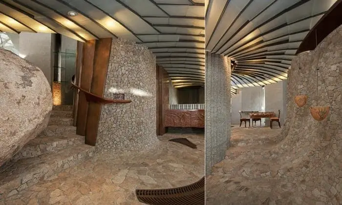 No se han publicado los planos de planta de esta vivienda, pero sí hay un buen reportaje gráfico, así como un interesante vídeo. Sabemos que en total tiene 3 dormitorios, el principal está situado en la parte alta, dentro de un espacio circular desde el que se divisa el salón. La misma estructura que forma la casa es asimilada en el diseño de otros elementos: verja de acceso al recinto, puertas, mobiliario, y accesorios… Pero también dialoga con las rocas del lugar, pues muchas de ellas están integradas formando parte de la casa.