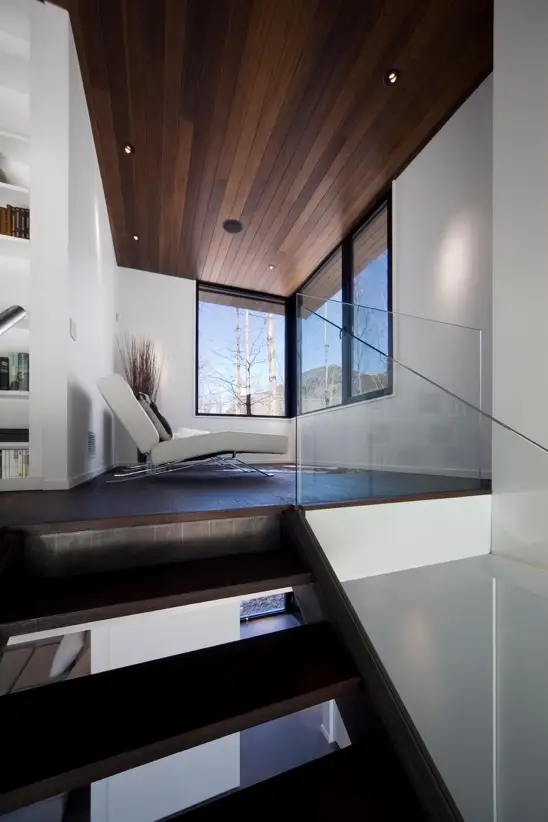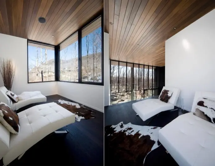La fachada de la casa se caracteriza por una composición sofisticada de texturas y materiales que se complementan con el entorno montañoso. Los revestimientos de madera aplicados sobre el exterior y los techos interiores, sirven como elementos decorativos. Además promueven una sensación de continuidad con el paisaje forestal circundante. Esta elección de materiales naturales se extiende por toda la estructura, creando una cohesión visual que resulta tremendamente elegante.
