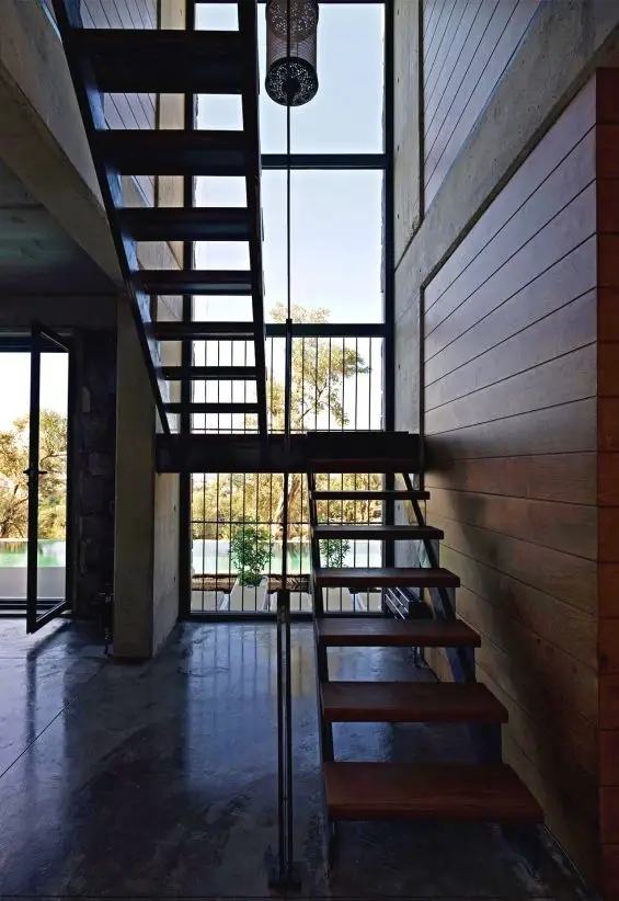 La escalera está ubicada en uno de los cuerpos de vidrio. Sus peldaños no tienen tabicas, precisamente para dejar paso a la luz natural.