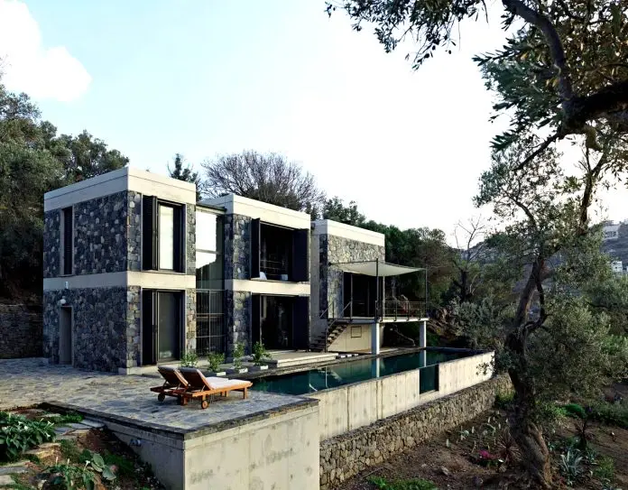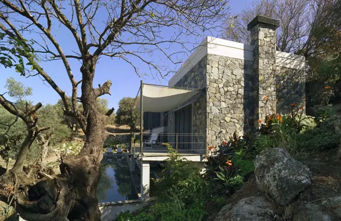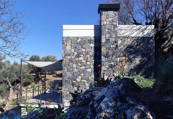 El diseño de la residencia está orientado a un estilo de vida moderno con un mínimo impacto ambiental. Enmarca la plasticidad de las rocas en la parte trasera y el mar Egeo en el frente. Esta integración armoniosa con la topografía y el paisaje se muestra de manera natural y discreta, considerando su entorno.