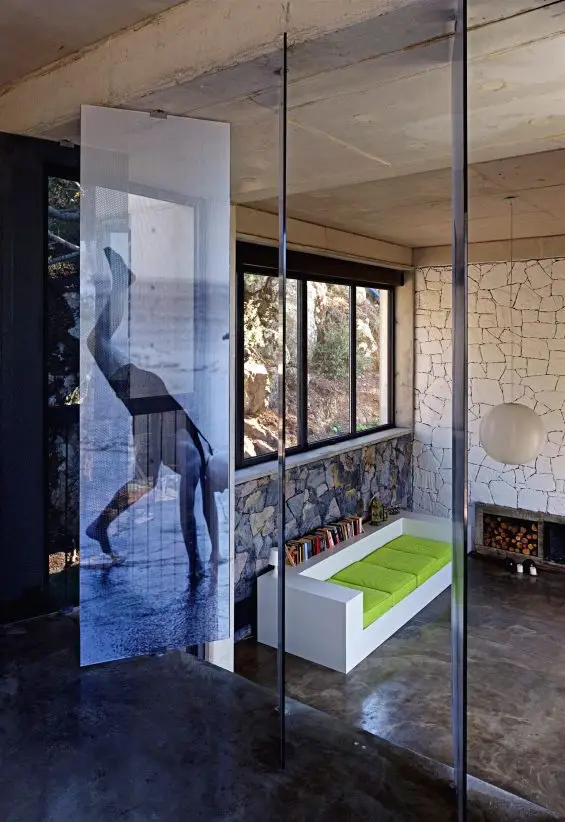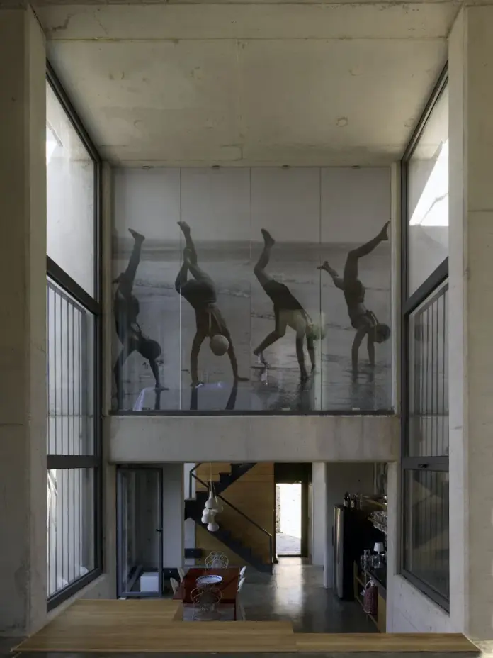 La fachada principal, adornada con grandes ventanales y muros de piedra natural, establece una conexión visual con el entorno. Sin embargo, el contraste sorprendente surge al explorar el interior: hormigón visto. En la pared del piso superior se ha creado un ingenioso y artístico diseño interior. La pared se compone de paneles que completan una imagen cuando están cerrados.